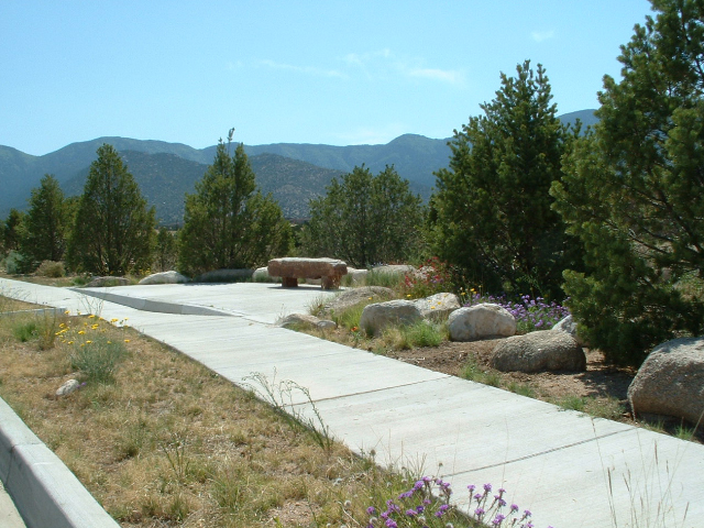 Sites Southwest completed master planning and design for this 1,400-acre parcel in the foothills of Albuquerque, New Mexico. The development encompasses about 2,300 dwelling units built over a 14-year period, with 30% of the land saved for open space and conservation. High Desert had the foresight to plan and design a community that held Water Conservation in the highest regard. All precipitation runoff is harvested into streetscapes, landscapes, parks, and open spaces to create a truly sustainable landscape for the community. Sites Southwest developed the approved plant list and landscape revegetation guidelines, designed almost all of the landscapes, and was a member of the community review committee. The landscapes are drought tolerant; almost all utilize native plants and harvested water from roadways, rooftops, and other impermeable surfaces. All materials were also selected for sustainability and come from within 50 miles of the community. To lessen the impact on the environment, the native landscape was protected and enhanced through passive gravity irrigation. This system provides a means of using moisture that would otherwise be lost and provides the community with a demonstration of innovative alternative technology.