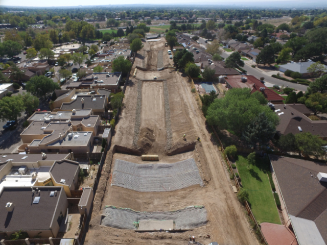 AMAFCA implemented the Lower Bear Tributary Arroyo Regional Water Quality Facility to protect the water quality of the Rio Grande and the aquifer located below the City of Albuquerque. It features a multi-part stormwater treatment train. As stormwater runoff from rainfall events moves through this arroyo – from Wyoming Blvd. to Spain Rd. – it passes through a series of controls, each designed to remove pollutants from the stormwater. The “cars” in this treatment train each feature different components of stormwater quality enhancement techniques.
