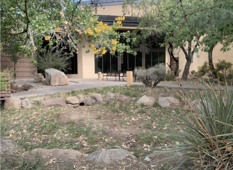 The Explora and the Explora X Studio were both designed by Sites Southwest and encompass four distinct projects commissioned over a 15 year timespan.  Because the mission of Explora is learning, museum staff and the landscape architects wanted to engage visitors from the moment that they arrived at the interactive museum. For that reason the landscape and its water collection systems became a very literal part of the experience and every building roof and hard surface on the site drains into the landscape. Like the main portion of the museum, the newly constructed Explora X Studio utilizes precipitation for its landscapes, particularly in the ponding areas. Two interconnected ponds capture precipitation and utilize it for Blue Grama Grass meadows, one of which is an outdoor classroom with a tidy arrangement of boulders grouped around the pond which doubles as seating.